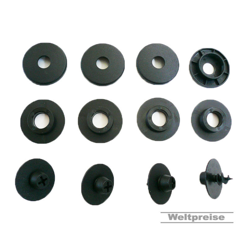 Für die eigentliche Befestigung liegen vier für Fußmatten typische Klemmpilze bei, die in den Fahrzeugteppich geschraubt werden.